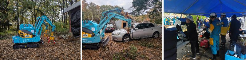 (左から)倒壊家屋からの救助訓練、車両からの救助訓練、遠隔操作の様子
